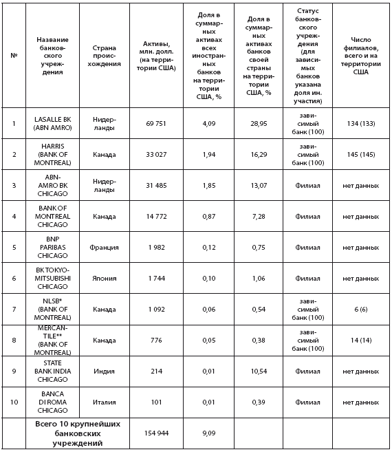 Таблица 5. 10 крупнейших иностранных банковских учреждений в Чикаго (с пригородами), 2005 г.
