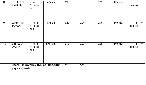Таблица 6. 10 крупнейших иностранных банковских учреждений в штате Калифорния, 2005 г.