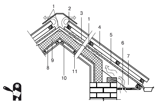 Рис. 4.8. Монтаж ондулина: 1 — вентиляционный зазор; 2 — обрешетка; 3 — рейки 3 x 5 см, по стропилам; 4 — кровельное покрытие; 5 — ветровлагозащитный слой «Изоспан А» (кровельный); 6 — отверстие для вентиляции кровли; 7 — стропильная нога; 8 — пароизоляция «Изоспан В»; 9 — утеплитель; 10 — внутренняя обшивка; 11 — рейка 3 x 5 см