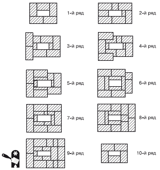 Шестой ряд кладется так же, как и пятый, со строгим соблюдением перевязки швов. Если высоту распушки нужно увеличить, пятый и шестой ряды чередуются.