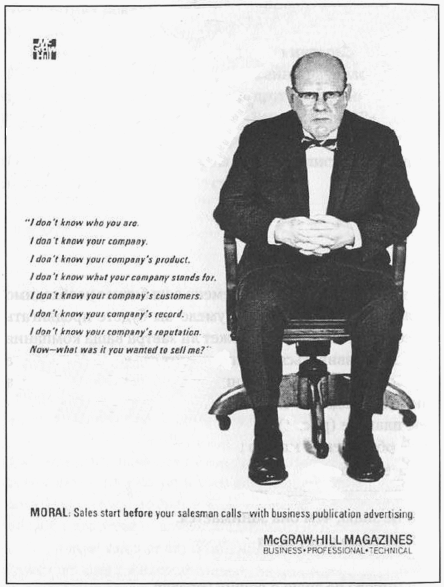 Затем приводится мораль. Продажи начинаются задолго до вашей встречи с потенциальным клиентом. С рекламы в деловых изданиях.