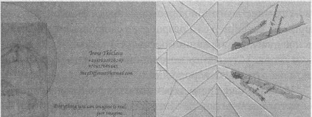 Внизу визитки рядом со знаменитым рисунком крыла Леонардо да Винчи располагалось высказывание Пабло Пикассо: «Все, что можно себе представить, — реально» («Everything you can imagine is real»).
