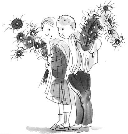 Утром все суетились и хлопотали, как будто Соня шла в первый класс. Только Соня вяло водила ложкой по утренней овсянке и думала: «Может, заболеть? Сейчас же осень. Осенью бродят вирусы — так мама говорит, а она врач, она знает». Соня потрогала лоб — жара не было. Специально покашляла — получилось не хрипло. Да еще папа, пробегая мимо, решил, что дочка подавилась. Он на ходу так хлопнул ее по спине, что Соня закашлялась по-настоящему, забрызгала блузку…