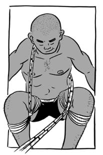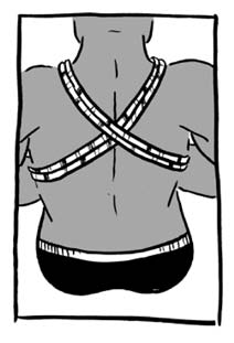 Вот сбруя для тела, выполненная другими узлами, – на случай, когда вам захочется узнать что-то новое о японских способах связывания. Этот прием называется «шибари». Эта сбруя отлично подходит как для мужчин, так и для женщин, ее просто надо немного приспособить к формам и особенностям каждого человека. Это очень простой вариант данного вида связывания. Более детально этот вариант сбруи описан в моей книге «Соблазнительное искусство японского связывания».