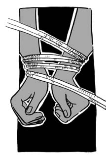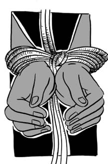Активный партнер. Сложите веревку пополам. Скажите партнеру, чтобы он протянул вам руки ладонями внутрь. Проследите, чтобы запястья не касались друг друга, иначе вы не сможете завершить связывание. Обмотайте сложенную веревку вокруг запястий вашего партнера 3–4 раза. Теперь перекрутите веревку и опустите оба ее конца между запястьями с обеих сторон витков, как показано на рисунке, а затем снова поднимите концы вверх с обеих сторон витков веревки, создавая наручники из веревки. Не делайте их слишком тугими. Надо, чтобы под витками веревки можно было просунуть один или два пальца. Теперь завяжите веревку простым квадратным узлом. У вас должен остаться достаточный кусок веревки для того, чтобы использовать его как поводок.