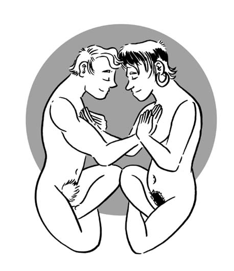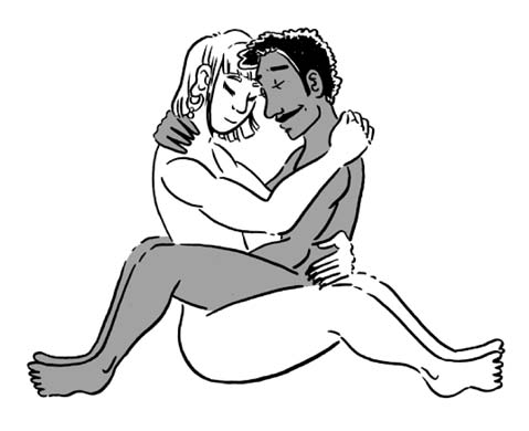Теперь поза. Она называется Яб Юм. Это классическая тантрическая сексуальная позиция. Один партнер сидит на подушке, неплотно скрестив ноги. Второй партнер сидит между его коленями лицом к первому, обвивая ногами его талию так, что подошвы его ног соприкасаются. Оба партнера кладут правую руку на заднюю часть шеи, а левую руку – на копчик партнера. Яб Юм можно выполнять как с проникновением, так и без проникновения. В данном упражнении мы выполним позу Яб Юм без проникновения, чтобы вы могли сосредоточиться на обмене энергиями. В позе Яб Юм вы составляете с партнером идеальное энергетическое единое целое. Эта позиция позволяет вам смотреть прямо в глаза партнеру. Вы можете целоваться или прижаться лбами, соединив точки третьего глаза,