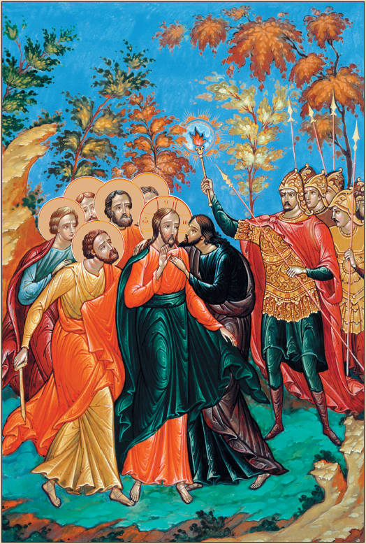 Иуда привёл их в сад, где молился Христос. Он приблизился к Нему и, целуя Его, сказал: «Здравствуй, Учитель!»