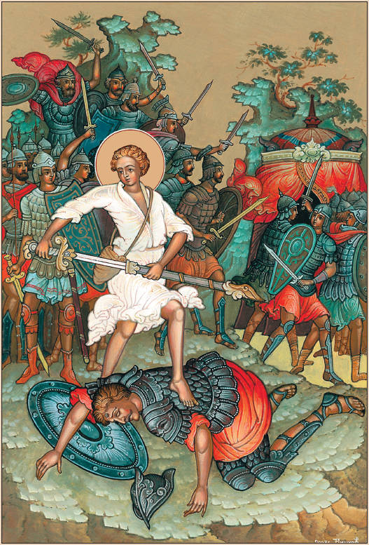 – Ты хвастаешься и гордишься, что ты такой сильный и имеешь такое длинное копьё, и думаешь, что это поможет тебе. А я надеюсь на Господа Бога, и Он поможет мне одолеть тебя.