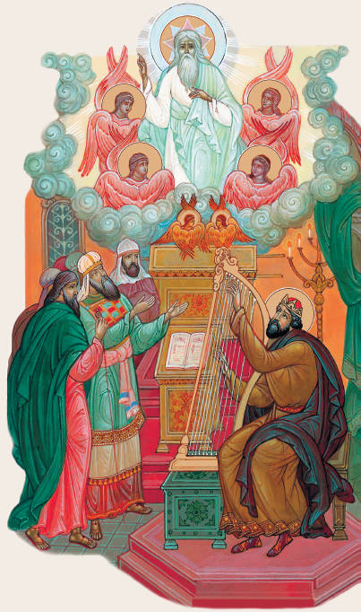 Каждый раз Давид возвращался с поля битвы окружённый своими подданными. Все пели священные песни и играли на гуслях и арфах и восхваляли Господа за дарование победы. Давид был очень умный и талантливый. Он сочинил целую книгу священных песен. Эту книгу, дети, вы, наверное, знаете, она называется Псалтирь и часто читается в церкви.