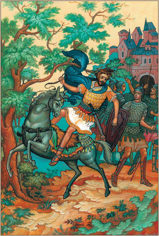 Вы знаете, дети, что Господь велит любить и почитать родителей, и поэтому за такое греховное намерение Он наказал Авессалома. Авессалом имел красивые длинные волосы. Когда он воевал против отца, ему пришлось быстро ехать через лес. И вот, он зацепился волосами за сук, лошадь убежала, а он остался висеть на дереве. Один солдат из войска Давида нашёл Авессалома и заколол его копьём.