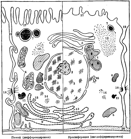 1 — ядро; 2 — ядрышко; 3 — хроматин; 4 — митохондрии; 5 — лизосомы; 6 — микротельца; 7 — секреторные пузырьки; 8 — агранулярный эндоплазматический ретикулум; 9 — гранулярный эндоплазматический ретикулум; 10 — гранулы гликогена; 11 — капли липидов; 12 — свободные рибосомы; 13 — связанные рибосомы; 14 — полисомы; 15 — гранулы неорганических веществ; 16 — центриоль; 17 — микроворсинки; 18 — межклеточные контакты; 19 — межклеточные пространства; 20 — базальная мембрана