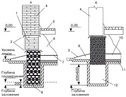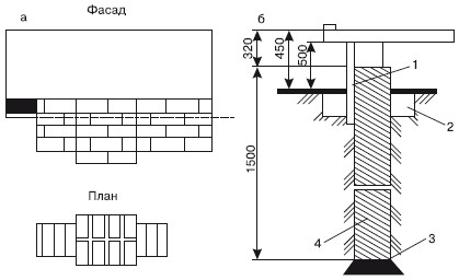 Рис. 4.21.Столбчатые фундаменты для бани: а– со столбами из кирпича; б– со сваей из асбестоцементной трубы: 1– асбестоцементный лист; 2– бетон; 3– подшивка фундамента; 4– асбестоцементная труба, заполненная бетоном