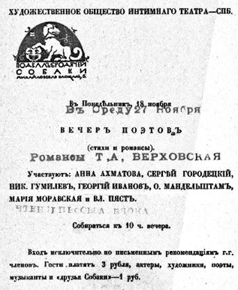 Афиша поэтического вечера в кабаре «Бродячая собака» с участием Николая Гумилёва. Вечер состоялся 27 ноября 1914 года
