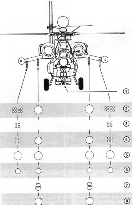 1 -установка НППУ-28 с пушкой 2А42, боезапас 250 патронов; 2-16 ПТУР «Атака» и два блока Б8В-20; 3-восемь УР «Игла»; 4-восемь ПТУР «Атака» и два бака ПТБ-460; 5-четыре блока Б8В-20; 6-четыре блока Б-13Л; 7-два контейнера УПК-23-250 с 23-мм пушками ГШ-23Л; 8-два бака ПТБ-460