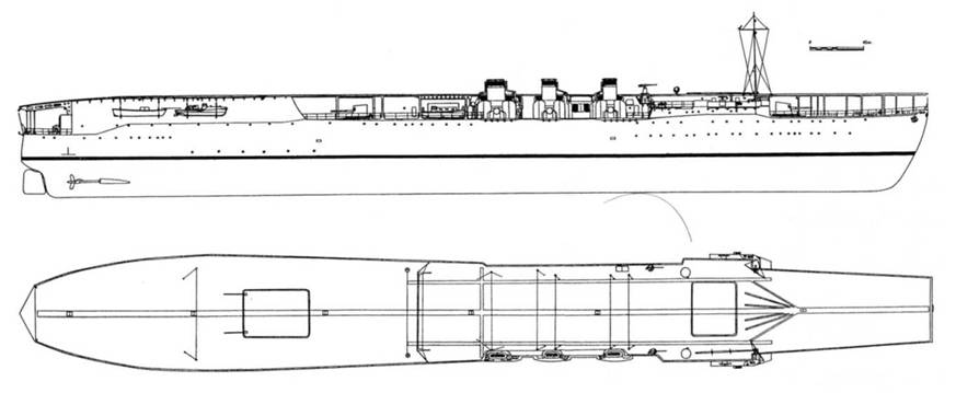 Л. СУАО для 200-мм и 120-мм орудий: визир центральной наводки тип 14; 2 – 6-м дальномера тип 14, с 1936 г.: СУАО для 200-мм и 127-мм орудий: визир центральной наводки тип 14 с 6-м дальномером тип 14; 6-м дальномер тип 14; СУАО для 127-мм орудий: 2 стабилизированных поста наводки тип 89 с 4,5-м дальномерами тип 93; прибор управления стрельбой тип 92, в 1941 г. были установлены 6 колонок прицельного визира для 25-мм зенитных автоматов тип 95 мод. 2. "КАГА" (провинция в северной части острова Хонсю, префектура Исикава). Был заложен как 2-й корабль в серии ЛК типа "ТОЗА". 5.02.1922 г. постройку приостановили и вскоре, в соответствии с Вашингтонским договором, отменили полностью. Корабль стали готовить к использованию в качестве мишени для артиллерийских стрельб. 9.11.1923 г. было решено достроить его как АВ, вместо разрушенного землетрясением линейного КР "АМАГИ". Работы провели на верфи ВМФ в Сасебо. После вступления в строй корабль вошел в состав 2-й ДАВ. В 1 1.1929 г. он был переведен в 1-ю ДАВ, а в 10.1933 г. – выведен в резерв. С 9.1934 г. по 10.06.1936 г. "КАГА" прошел модернизицию на верфи ВМФ в Сасебо. В ходе ее демонтировали башни с 200-мм орудиями, нижнюю полетную палубу и взлетную площадку. Верхнюю палубу удлинили до носовой оконечности, соответствующим образом увеличили размеры ангаров и теперь они вмещали 90 самолетов (против 60 до модернизации), из которых 25 находились в разобранном состоянии, ангары оснастили системой принудительной вентиляции, новейшими системами пожаротушения и установили 3 подъемника новой конструкции. Главные механизмы заменили на более мощные и совершенные. Вместо 12 устаревших котлов установили 8 нефтяных. Угольные бункеры перестроили в нефтяные танки. Дымоходы демонтировали и заменили на изогнутую вниз дымовую трубу по правому борту. По правому борту смонтировали небольшую островную надстройку. Для усиления противоторпедной защиты и повышения остойчивости по бортам установили були с максимальной шириной на миделе 1,5 м. С каждого борта оборудовали по 2 дополнительных каземата для 200-мм орудий. Зенитные 120-мм/40 орудия заменили на 127-мм/40 за легкими открытыми щитами и их число довели до 16 (по 8 с каждого борта в спаренных АУ). В бортовых спонсонах разместили 25-мм зенитные автоматы. 10.06.1936 г. "КАГА" передали флоту, и в 7. 1936 г. его включили в 1-ю ДАВ Первого флота. С 1.1939 г. по 27.02.1939 г. (по другим данным до 19.02. 1939 г.) он участвовал в кампании против Китая, оперируя в Южно-Китайском море. В 3.1940 г. самолеты с "КАГА" бомбили наземные объекты в центральной части Китая и вели разведку в интересах Армии. В 1940 г. на верфи ВМФ в Иокосуке АВ прошел плановый ремонт с установкой новых средств радиосвязи и систем управления огнем для 200-мм и 127-мм орудий. Кроме того, провели работы по усилению конструкции полетной палубы. В 4.1941 г. самолеты АВ отрабатывали на корабле-цели "СЕТЦУ" новые приемы бомбометания. С 5.1941 г. по 26.11.1941 г. совместно с АВ 1 и 2-й ДАВ "КАГА" осуществлял подготовку к операции против Перл-Харбор в заливах Ариаке и Танкан. В соответствии с планом этой операции 7.12. 1941 г. 36 самолетов с "КАГА" (15 бомбардировщиков, 12 торпедоносцев и 9 истребителей) нанесли удар по американскому флоту на острове Оаху. Во второй волне были задействованы 18 бомбардировщиков под прикрытием 9 истребителей. По докладу пилотов в ходе обоих атак им удалось добиться 3 торпедных попаданий в ЛК "ARIZONA", 2 – в ЛК "TENNESEE", 4 – в ЛК "OKLAHOMA", 4 – в Л