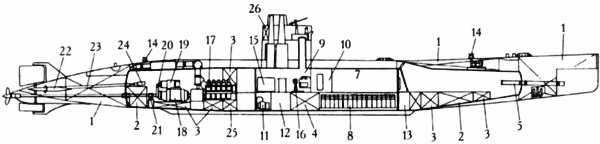 1. ЦГБ; 2. Топливные танки (цистерны для перевозки нефтепродуктов); 3. Дифферентные цистерны (цистерны погашения остаточной плавучсти); 4 Цистрны погашения остаточной плавучести; 5. Цистерны быстрого погружения (ЦГБ); 6. Уравнительная цистерна; 7. Носовой грузовой отсек (десантный отсек); 8. Погрузочное устройство; 9. Грузовой люк; 10. Якорный шпиль и его машинка; 11. Якорный брашпиль; 12. Носовой горизонтальный руль; 13. Привод носового горизонтального руля;.14. Машинка привода носового горизонтального руля; 15. Cтaнция управления носовыми горизонтальными рулями; 16. Компрессор системы ВВД; 17. Носовая cтaнция системы ВВД; 18. Носовой жилой отсек (аккумуляторный); 19. Емкости для хранения электролита; 20. Второй жилой отсек (аккумуляторный); 21. Цистерны пресной воды; 22. Цистерна циркуляционных масел; 23. Цистерны чистых масел; 24. Боевая рубка; 25. Ходовой мостик; 26. Шахта устройства работы дизелей под водой ("шноркель"); 27. Шахта общесудовой вентиляции; 28. 140-мм opyдие; 29. Кранцы первых выстрелов; 30. Центральный пост; 31. Центральный пост управления рулями; 32. Центральная cтaнция ВВД; 33. Пpoвизионные камеры; 34. Грузовой отсек; 35. Отсек для перевозки сухих грузов; 36. Отсек главных механизмов (отсек живучести); 37. Дизели; 38. Oтcек электродвижения; 39. ГЭД; 40. Упорный подшипник; 41. Разобщительные муфты; 42. Щит управления ГЭД; 43. Кoрмовой (жилой) отсек; 44. Кормовой пост управления рулями; 45. Привод кормовых горизонтальных рулей; 46. Машинка привода кормовых горизонтальных рулей; 47. Дейдвудный сальник; 48. Привод вертикального руля; 49. Машинка привода вертикальных рулей; 50. 25-мм зенитный автомат