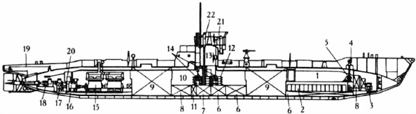 1. Помещение для экипажа ПЛ; 2. АБ; 3. Механизм привода горизонтальных рулей; 4. Якорный брашпиль; 5. Механизм привода якорного брашпиля; 6. Цистерна пресной воды; 7. Уравнительная цистерна; 8. Топливные танки; 9. Грузовые трюмы; 10. Центральный пост; 11. Погреб для хранения 37–мм патронов; 12. Баллоны системы ВВД; 13. Боевая рубка; 14. Маховики приводов клапанов вентиляции ЦГБ; 15. Дизель; 16. ГЭД; 17. Редуктор гребного вала с упорным подшипником; 18. Механизм привода кормовых горизонтальных рулей; 19. Привод вертикального руля; 20. Щит управления ГЭД; 21. Ходовой мостик; 22. Тумба перископа