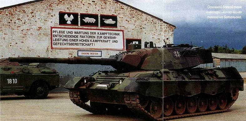Основной боевой танк "Леопард 1А5" из 403-го танкового батальона. Слева – БРДМ-2 бывшего 27-го мотострелкового полка ННА ГДР. Шверин, апрель 1991 года.