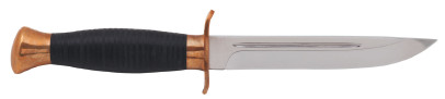 Модификация финки с травмоопасной рукоятью, представленная на фото напротив, имеет клинок толщиной 4 мм, но лишена гарды, фиксирующей руку при нанесении колющего удара.