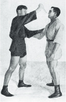 Кстати, НА-40 сильно отличался от «финки НКВД» именно в сторону своей «узкой специализации». Нехарактерная «перевернутая» S-образная гарда была продиктована боевой специализацией ножа, предусматривающей упор пальцев кисти при ударах снизу вверх в области подреберья и живота и сверху вниз в область лица и шеи, продиктованных тогдашними традициями ножевого боя НКВД. Кстати, в том же 40-м году в качестве учебного пособия для школ НКВД впервые в СССР выходит книга В.П. Волкова «Курс самозащиты без оружия «Самбо» с главой «Основные приемы работы коротким финским или норвежским ножом», раскрывающая технику нанесения таких ударов (приведены фото из книги В.П. Волкова «Курс самозащиты без оружия «Самбо»).
