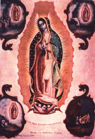 Первое явление Богоматери в Америке случилось 9 декабря 1531 года. Испанцы в то время завоевывали Новый Свет. В Мексике разыгралась настоящая религиозная война, которую выиграли выходцы с Иберийского полуострова. Сотни тысяч майя и ацтеков были убиты, любое слияние двух культур казалось невозможным. И вот, ранним декабрьским утром 1531 года 51-летний индеец Хуан Диего услышал необычную музыку, которая исходила, казалось бы, ниоткуда. Он поднял глаза к небу, и тут до него с небосвода донесся голос, повелевший подняться Хуану на холм Тепеуак. Добравшись до вершины, индеец увидел Деву изумительной красоты, чье одеяние сияло как солнце. Все камни вокруг, в том числе и скала, на которой стояла Дева, сверкали и искрились как драгоценные