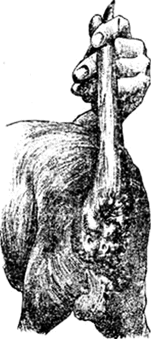 Рак anus'a представляет из себя неровную, бугристую, иногда грибообразную, капустообразную, по большей части, довольно твердую, опухоль (Рис. 69).