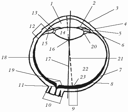 Орган зрения представлен глазом. Он состоит из глазного яблока, соединенного посредством зрительного нерва с головным мозгом, и вспомогательных органов. Само глазное яблоко имеет шаровидную форму и расположено в костной впадине – глазнице, или орбите, образованной костями черепа. Передний полюс выпуклый, а задний несколько уплощен (рис. 10).