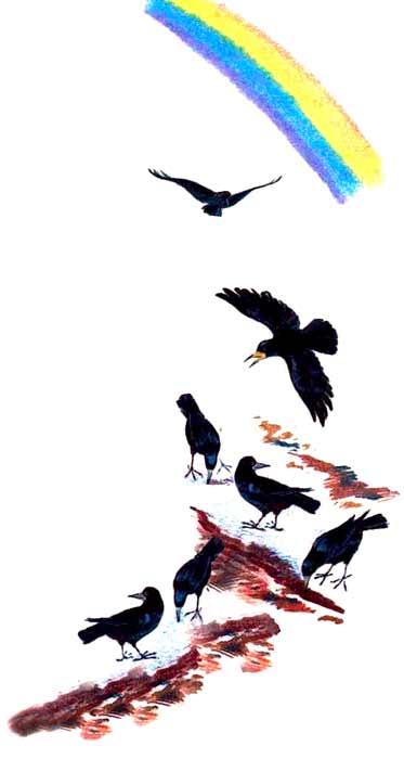Но вот небо закрыли тучи, подул резкий холодный ветер, и вдруг пошёл снег, да какой: хлопьями и сразу, будто зимой, укрыл всю землю. Тонкой ледяной плёнкой подёрнулись ручейки, смолкли голоса птиц. Кажется, вновь вернулась зима.