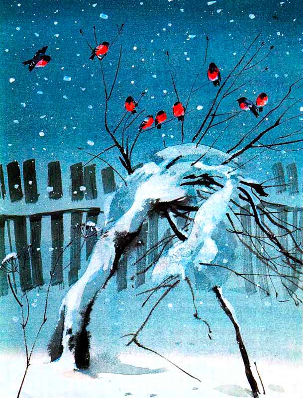 Но беда в этом невелика. Зато поглядите, как ослепительно белеет на солнце свежий, только что выпавший снег и какие ярко-синие тени лежат на нём от деревьев. Такого блеска снега и таких синих теней зимой не бывает. Это уже преддверие весны.