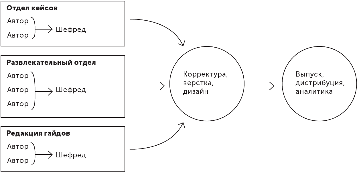 Юниты или отделы. По мере роста редакции у вас появятся отделы, которые занимаются каким-то жанром. У каждой миниредакции будет свой ответственный человек и какая-то команда, например автор и редактор. Примеры из практики: