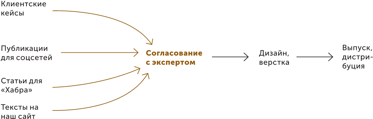 Последний способ – перестроить процесс, чтобы пустить часть материалов мимо бутылочного горлышка. Например, если пост написан на базе учебника, мы его не согласовываем с экспертом. А для коротких текстов типа «ответы на вопросы» – не рисуем обложку с дизайнером, а используем заранее заготовленный шаблон. Вот еще пример из практики: