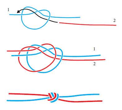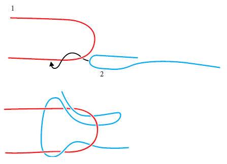 1. Сформировать на веревке 1 закрытую петлю, расположив ее ходовой конец под корневым. Провести через получившуюся петлю, с тыльной стороны, вторую веревку и сложить новую петлю, зеркально отражающую первую.