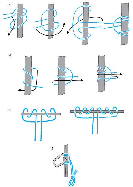 Рис. 102. Прусик: а – репшнуром в форме петли; б – одним концом репшнура; в – «тройной»; г – карабинный вкладыш