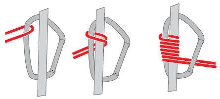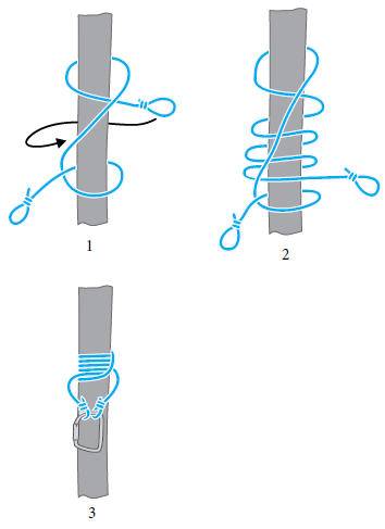 1. Сделать ходовым концом репшнура два шлага вокруг основной веревки и обвести его вокруг корневого конца шнура. Провести еще один обвод вокруг веревки, но уже в противоположном первым двум шлагам направлении.