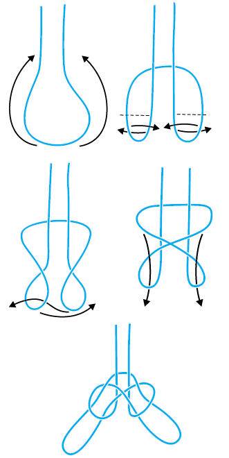 3. Подтягивая за три петли, затянуть узел, зафиксировать корневой и ходовой концы троса узлом, при необходимости сформировав четвертую петлю.