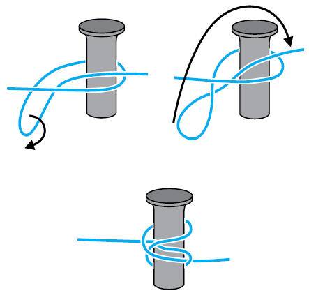 1. Ходовой конец троса обнести вокруг битенга или причальной тумбы, сложить свободный конец в форме открытой петли и завести под корневой конец.
