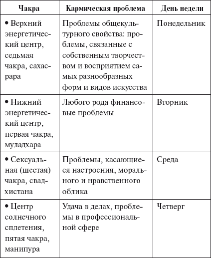 Чакр, как вы уже знаете, в общей сложности семь – ровно столько, сколько дней в неделе. Каждой чакре соответствует свой день недели. В таблице обозначены эти соответствия и отмечены проекции каждой из семи чакр на конкретные группы личных проблем, характерных для многих моих пациенток.