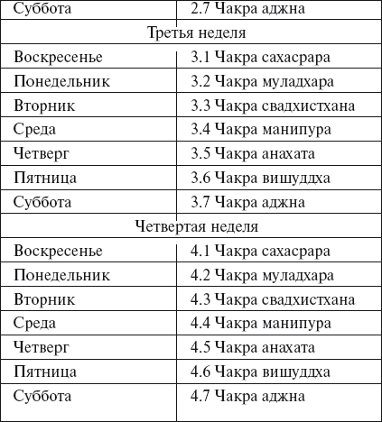 Для вашего удобства привожу таблицу-график распределения чакр по 28 дням. Обращаю ваше внимание на то, что произнесение вечером происходит по чакре следующего дня.