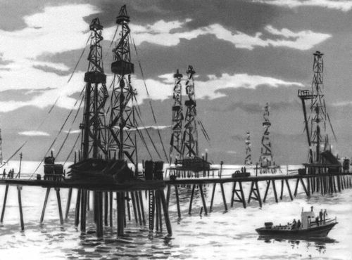 Советская графика. М. Ю. Рахманзаде. «Эстакада» из серии «Нефтяные Камни». Автолитография. 1956—57.