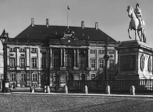 Н. Эйтвед. Дворцовый комплекс Амалиенборг в Копенгпгене. 1750—54. Один из корпусов. Справа — памятник королю Фредерику V (бронза, 1768, скульптор Ж. Ф. Сали).