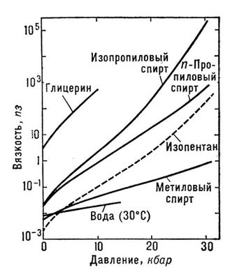 Рис. 8. Зависимость вязкости жидкостей от давления при комнатной температуре.