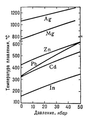 Рис. 13. Зависимость температуры плавления металлов от давления.