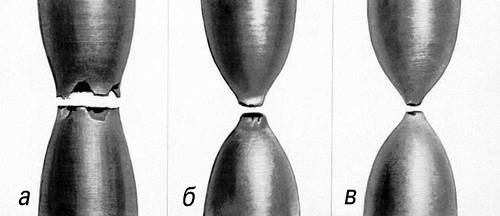 Рис. 9. Фотографии образцов стали, разорванных при осевом растяжении в условиях различных гидростатических давлений в жидкости, окружающей образец (а — атмосферное давление; б — 8,5 кбар ; в — 16,5 кбар ). Уменьшающаяся от а к в площадь поверхности разрыва указывает на увеличение пластичности стали с ростом давления.
