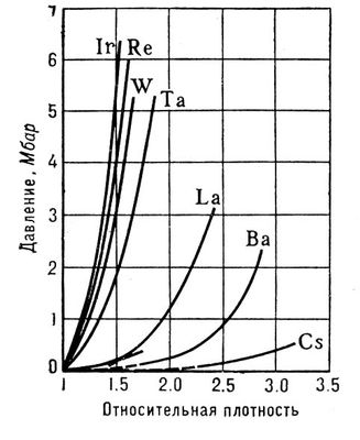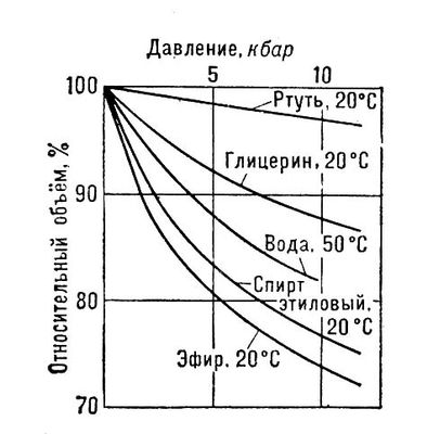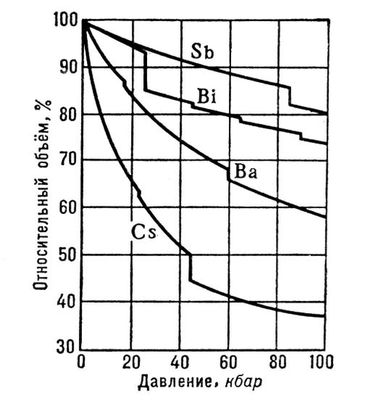 Рис. 10. Изменение объёма (плотности) некоторых простых веществ при полиморфных переходах. Величина вертикальной ступеньки на каждой кривой соответствует изменению объёма при переходе.