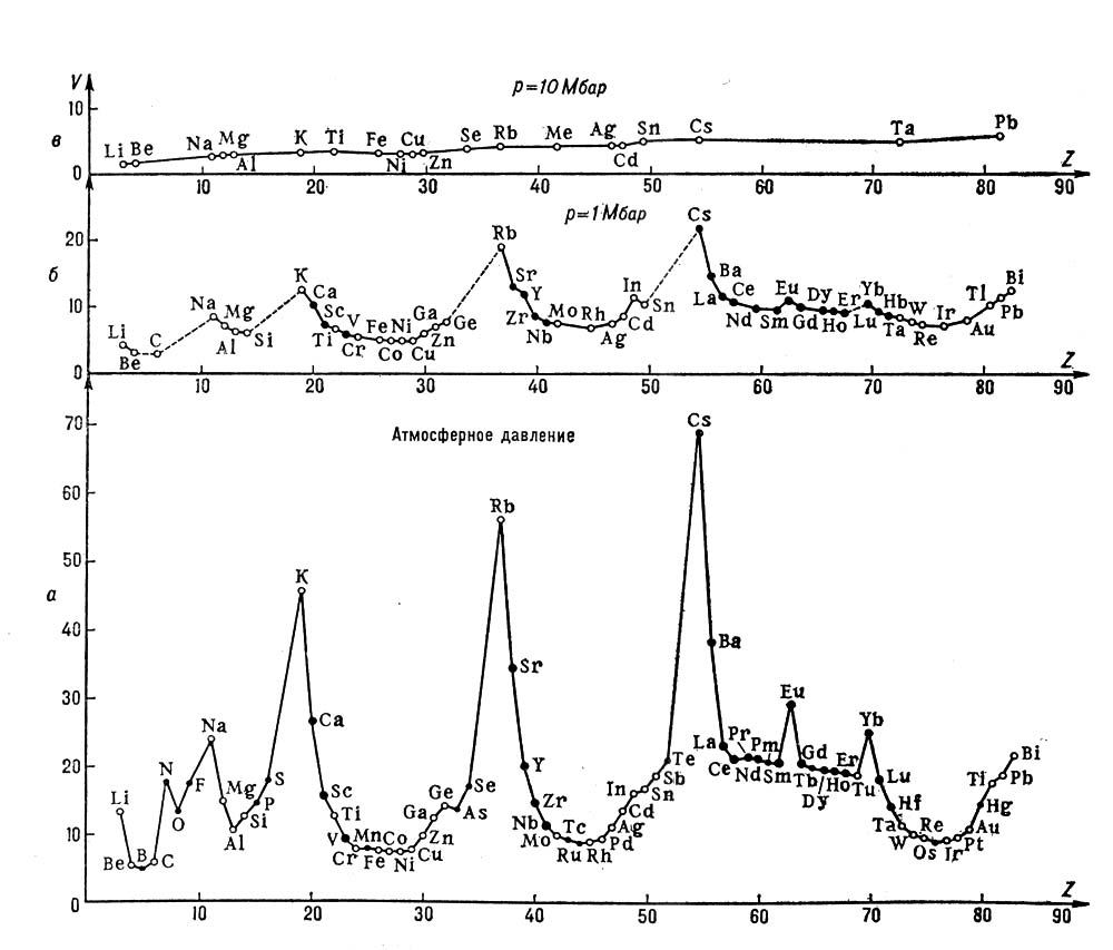 Рис. 7. Зависимость атомных объёмов V элементов (в см3 /г—атом ) от порядкового номера Z: а — при нормальных условиях; б — при давлении 1 Мбар ; в — вычисленные данные для 10 Мбар .