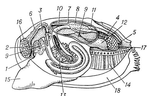 Схема внутреннего строения беззубки (Anodonta): 1 — ротовое отверстие; 2 — пищевод; 3 — желудок; 4 — кишка; 5 — анальное отверстие; 6 — печень; 7 — околосердечная сумка; 8 — желудочек сердца; 9 — предсердие; 10 — передняя аорта; 11 — задняя аорта; 12 — почка; 13 — гонада; 14 — полужабра; 15 — нога; 16 — передний мускул-замыкатель; 17 — задний мускул-замыкатель; 18 — мантийные складки.