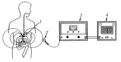 Рис. 1. Схематические изображения принципа работы радиотелеметрической системы для исследования функций пищеварительного тракта: 1 - радиопилюля в желудке; 2 - приемная антенна; 3 - радиоприемник; 4 - регистратор.