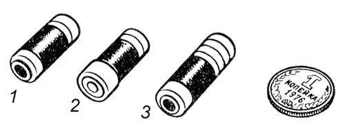 Рис. 2. Внешний вид радиопопилюль для исследования температуры (1), давления (2) и pH (3). Рядом для сравнения монета (1 коп.).