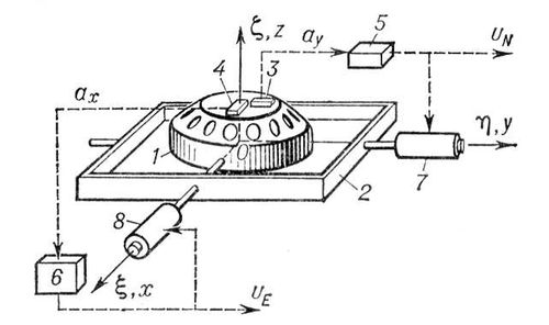 Прибором, позволяющим определять с высокой степенью точности направление вертикали при ускоренном движении объекта, на котором установлен прибор, является гироинерциальная вертикаль (рис. 3). В ней, кроме гироскопов, используются акселерометры и вычислительные устройства (интеграторы), при этом осуществляется искусственное моделирование маятника с периодом, равным периоду М. Шулера. Гироинерциальная вертикаль состоит из астатического трёхстепенного гироскопа, на гирокамере 1 которого расположены акселерометры 3, 4 (в реальных схемах акселерометры устанавливают на гиростабилизированной платформе). Измеряемые акселерометрами кажущиеся ускорения ax и ay объекта вдоль горизонтальных осей Ох и Оу поступают в интеграторы 5, 6; их выходные сигналы (скорости vE и vN вдоль осей Ох и Оу) вводятся на датчики моментов 7, 8, прикладывающие к гироскопу моменты коррекции, которые вызывают