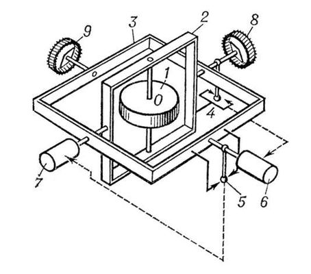 Рис. 1. Принципиальная схема гировертикали с маятниковой коррекцией: 1 — ротор; 2, 3 — внутреннее и наружное кардановы кольца: 4, 5 — маятники-корректоры; 6, 7 — датчики моментов; 8, 9 — потенциометры.
